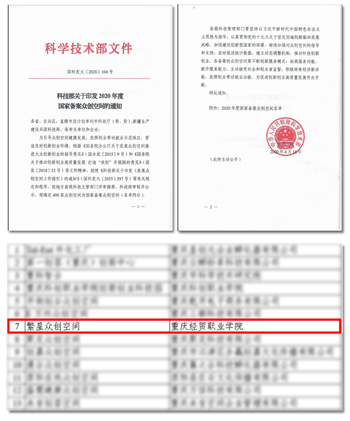 2020年4月23日,科技部印發(fā)《關(guān)于印發(fā)2020年度國(guó)家備案眾創(chuàng)空間的通知》(國(guó)科發(fā)火〔2020〕104號(hào)),我院繁星眾創(chuàng)空間獲批國(guó)家備案眾創(chuàng)空間,成功晉級(jí)“國(guó)家隊(duì)”。本次,重慶市眾創(chuàng)空間有13家晉升“國(guó)家級(jí)”,其中高校2家。
